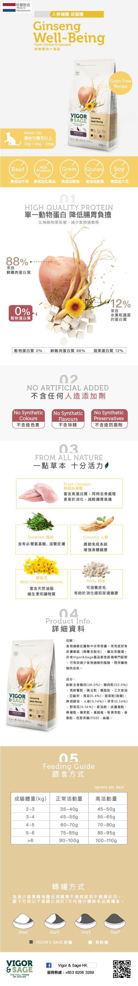 新鮮去骨雞肉(26.0%),雞肉(22.0%),馬鈴薯,豌豆,雞油,三文魚油,亞麻籽,海苔(0.4%),甜菜粕,啤酒酵母粉,人蔘(0.14%),茯苓(0.14%),野菊花(0.14%),番茄,胡蘿蔔,檸檬,蘋果,蔓越莓,果寡糖,絲蘭。