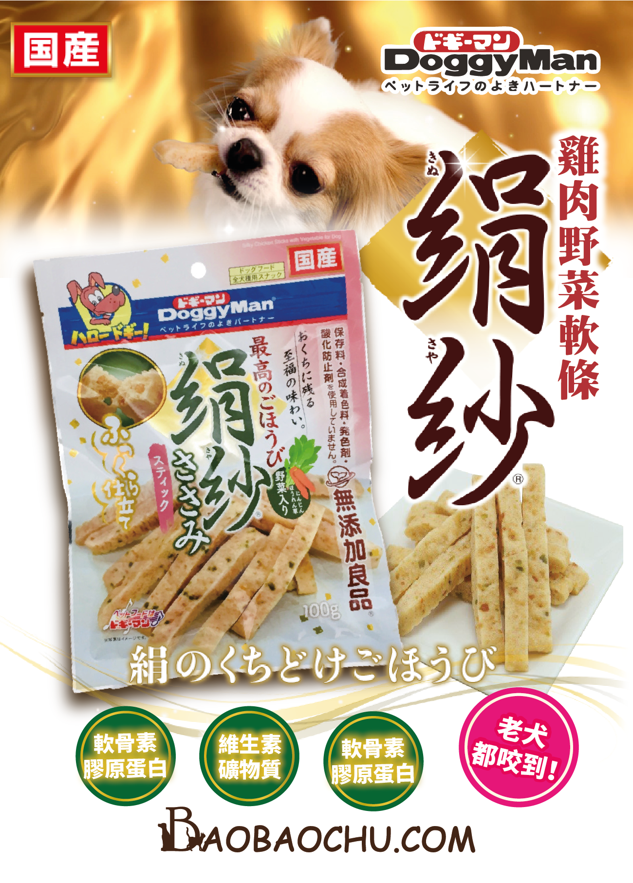 肉類(雞胸肉、雞柳、雞肝、雞肉)、小麥粉、白砂糖、玉米澱粉、木薯澱粉、調味料、膠原蛋白肽、魚軟骨提取物(含軟骨素)、甘油、海藻糖、山梨糖醇、膨脹劑、亞磷酸鹽(Na、K)、礦物質(鈉)、色素(梔子)、氨基葡萄糖