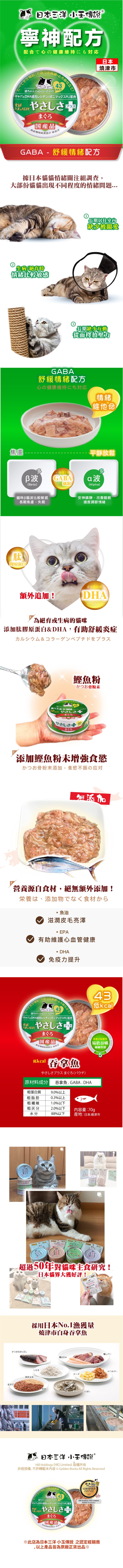 吞拿魚、吞拿魚提取物、膳食纖維、鰹魚乾、鰹魚骨粉、膠原蛋白肽、低聚醣、GABA、增稠穩定劑(黃原膠)、維生素E